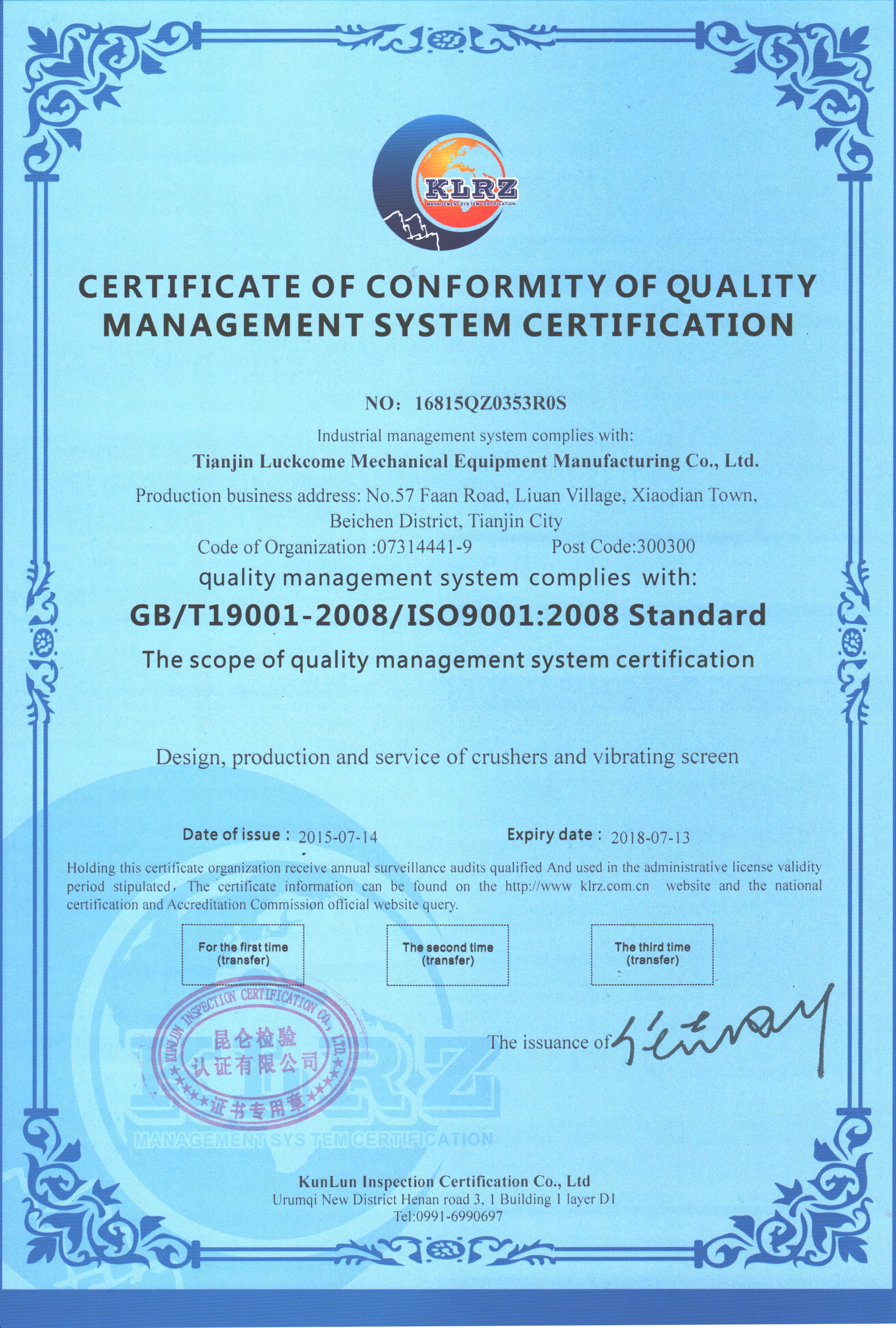 Tianjin Luckcome obtain the certificate of conformity of qua